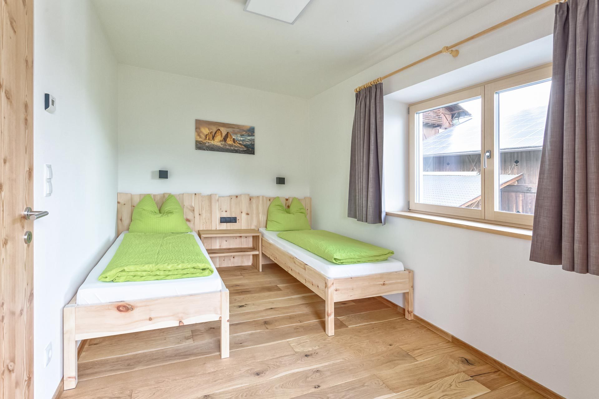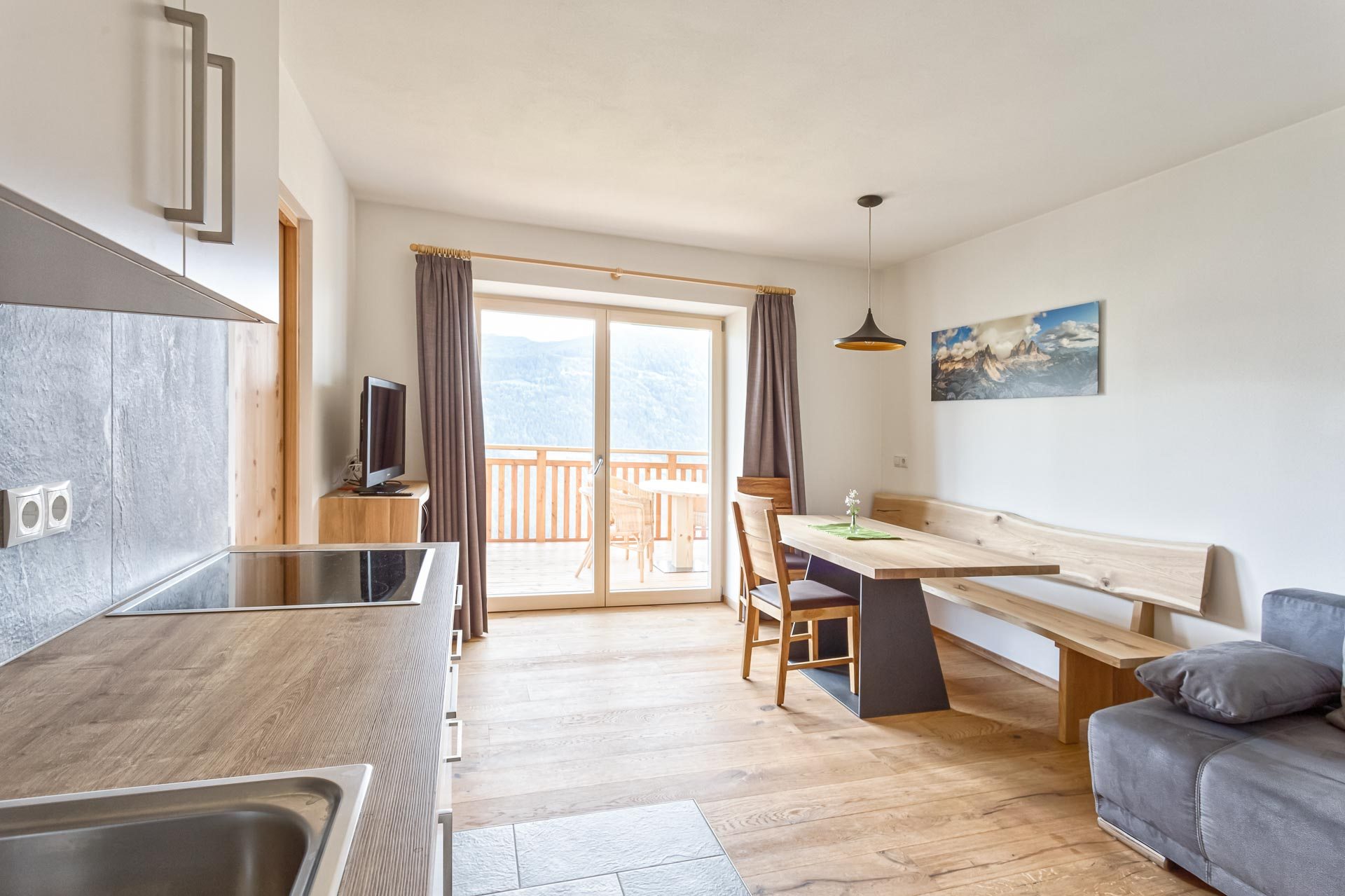 I materiali naturali degli appartamenti danno la sensazione di un’assoluta vicinanza alla natura: pavimenti in legno e piastrelle di pietra, alcuni mobili in pino cembro, abete rosso e quercia sono stati realizzati da Markus, il proprietario, e coniugano tradizione ed innovazione.
