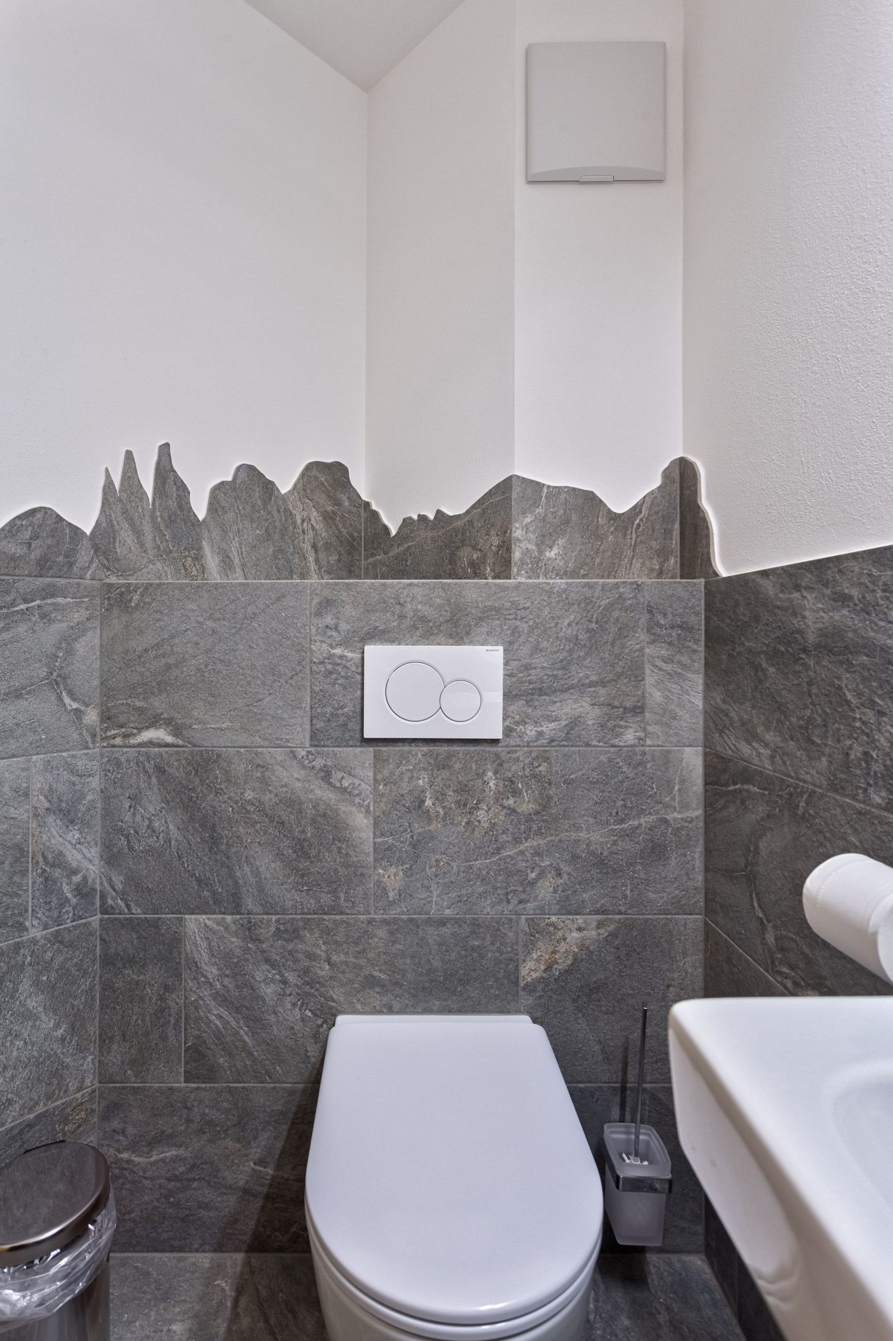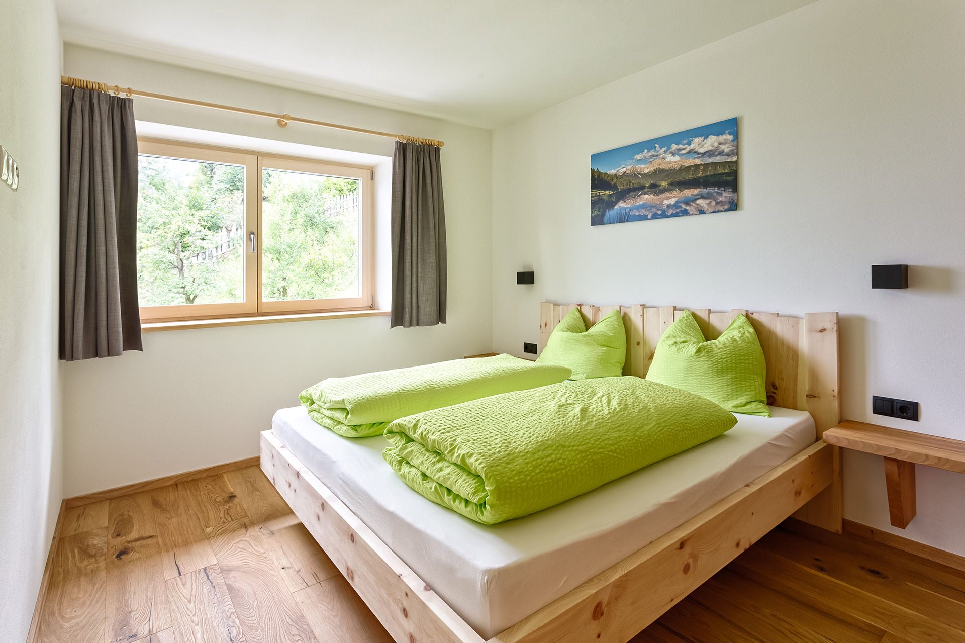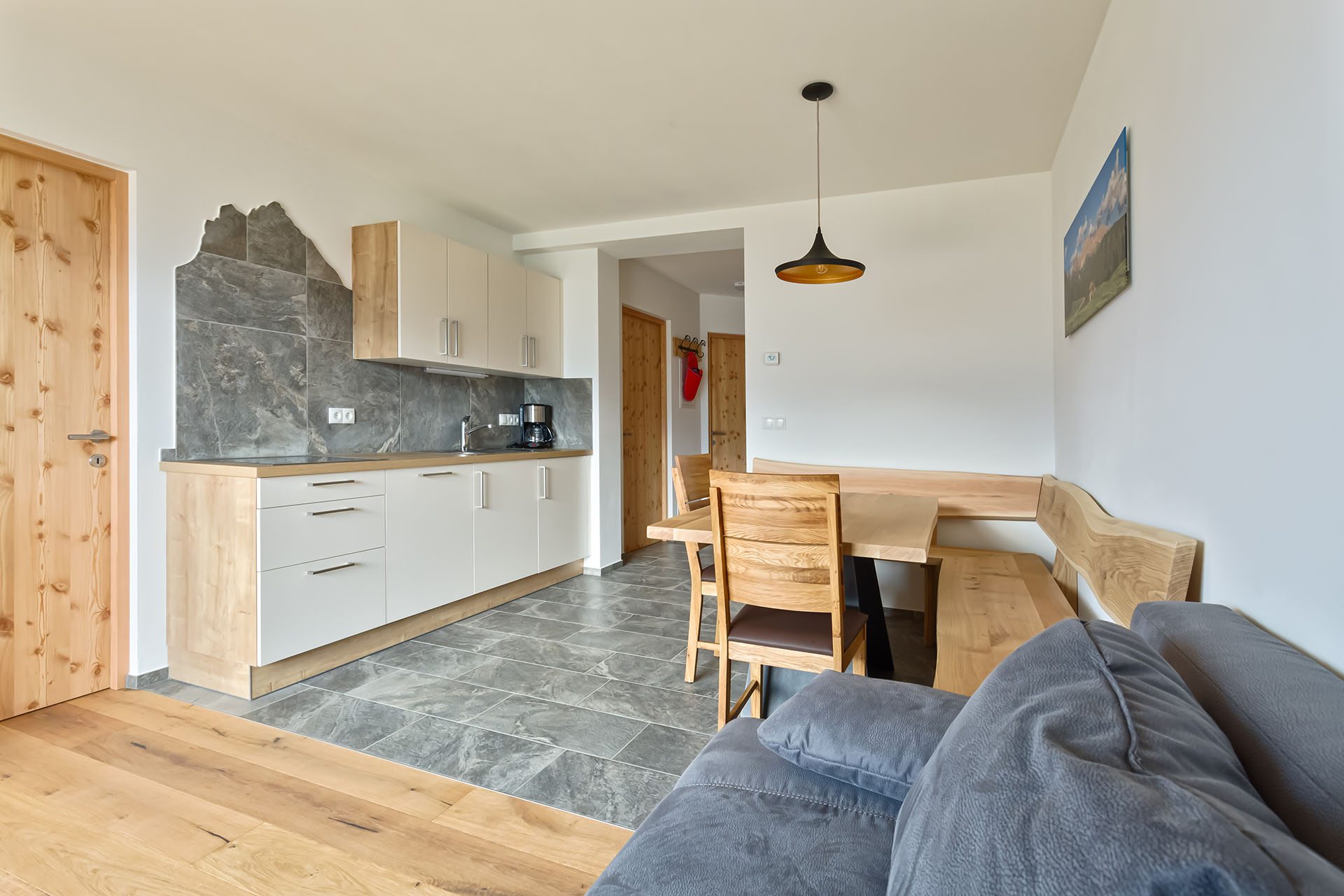 I materiali naturali degli appartamenti danno la sensazione di un’assoluta vicinanza alla natura: pavimenti in legno e piastrelle di pietra, alcuni mobili in pino cembro, abete rosso e quercia sono stati realizzati da Markus, il proprietario, e coniugano tradizione ed innovazione.