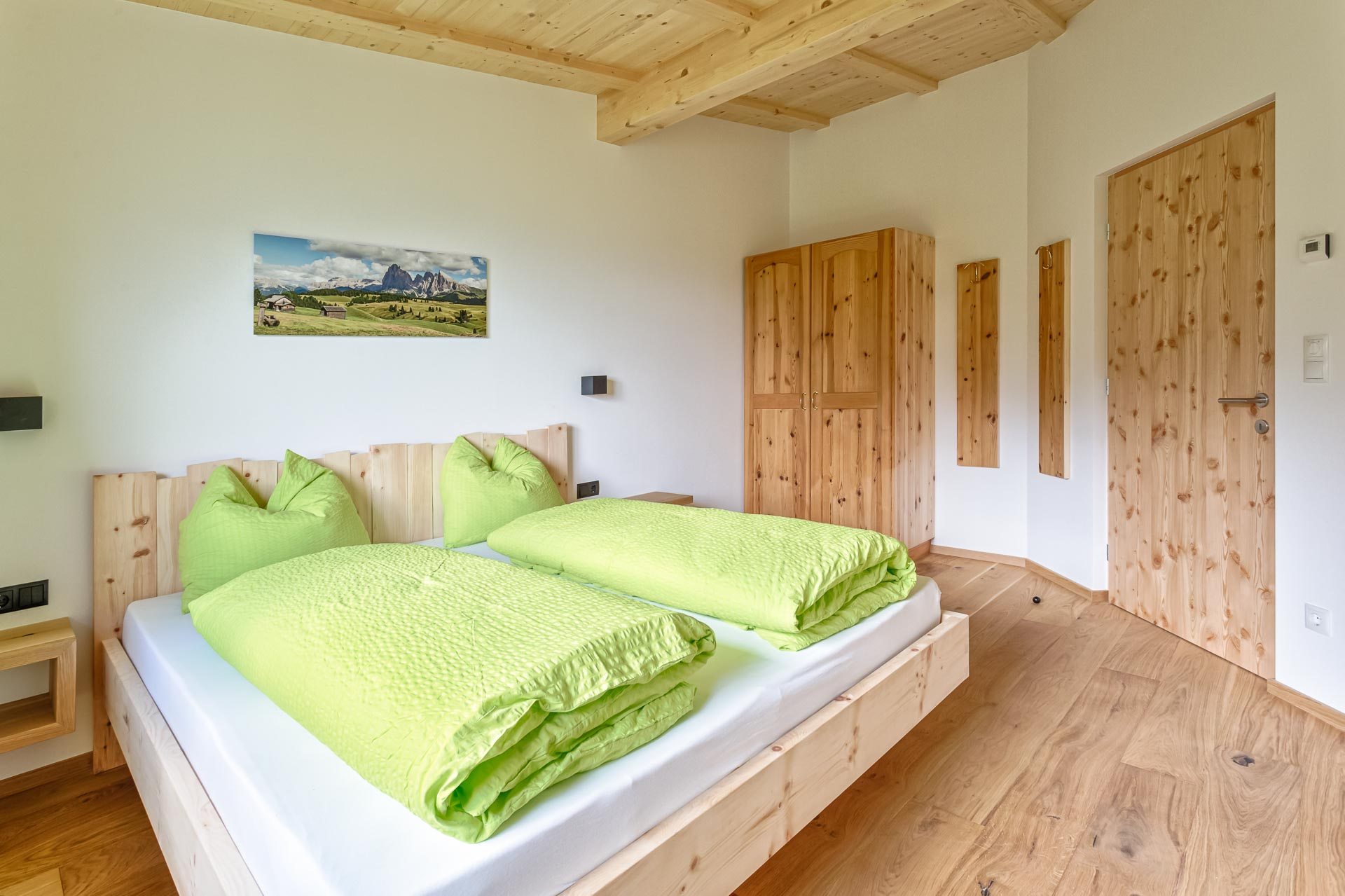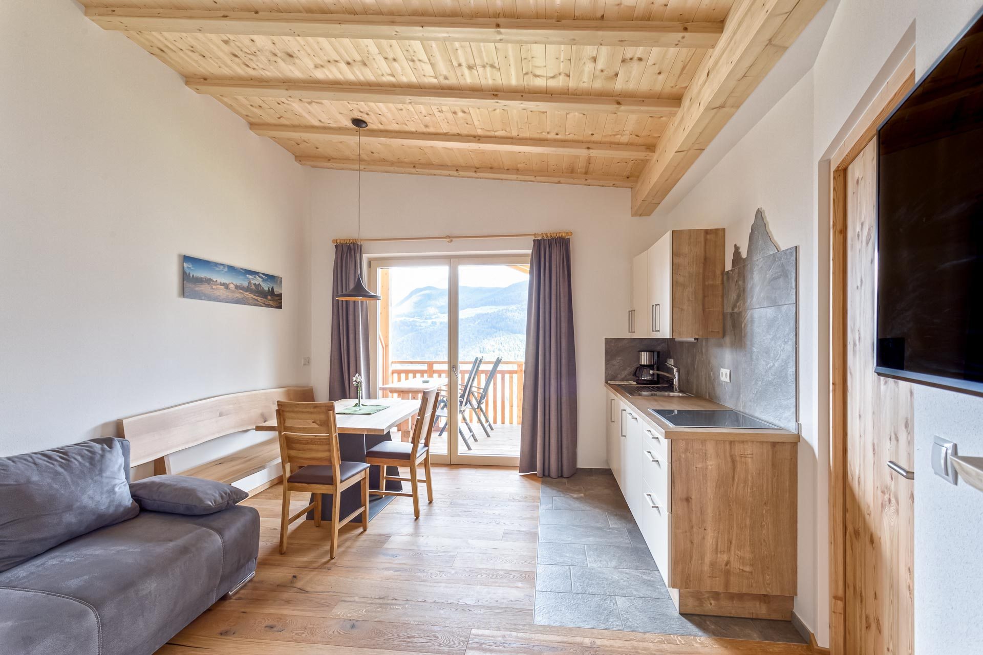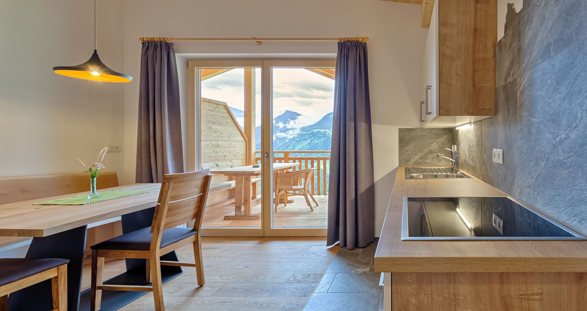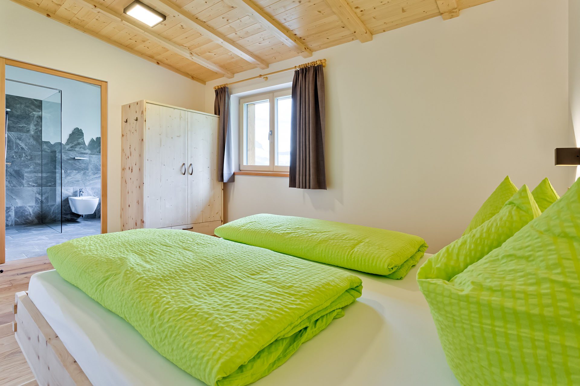 I materiali naturali degli appartamenti danno la sensazione di un’assoluta vicinanza alla natura: pavimenti in legno e piastrelle di pietra, alcuni mobili in pino cembro, abete rosso e quercia sono stati realizzati da Markus, il proprietario, e coniugano tradizione ed innovazione.