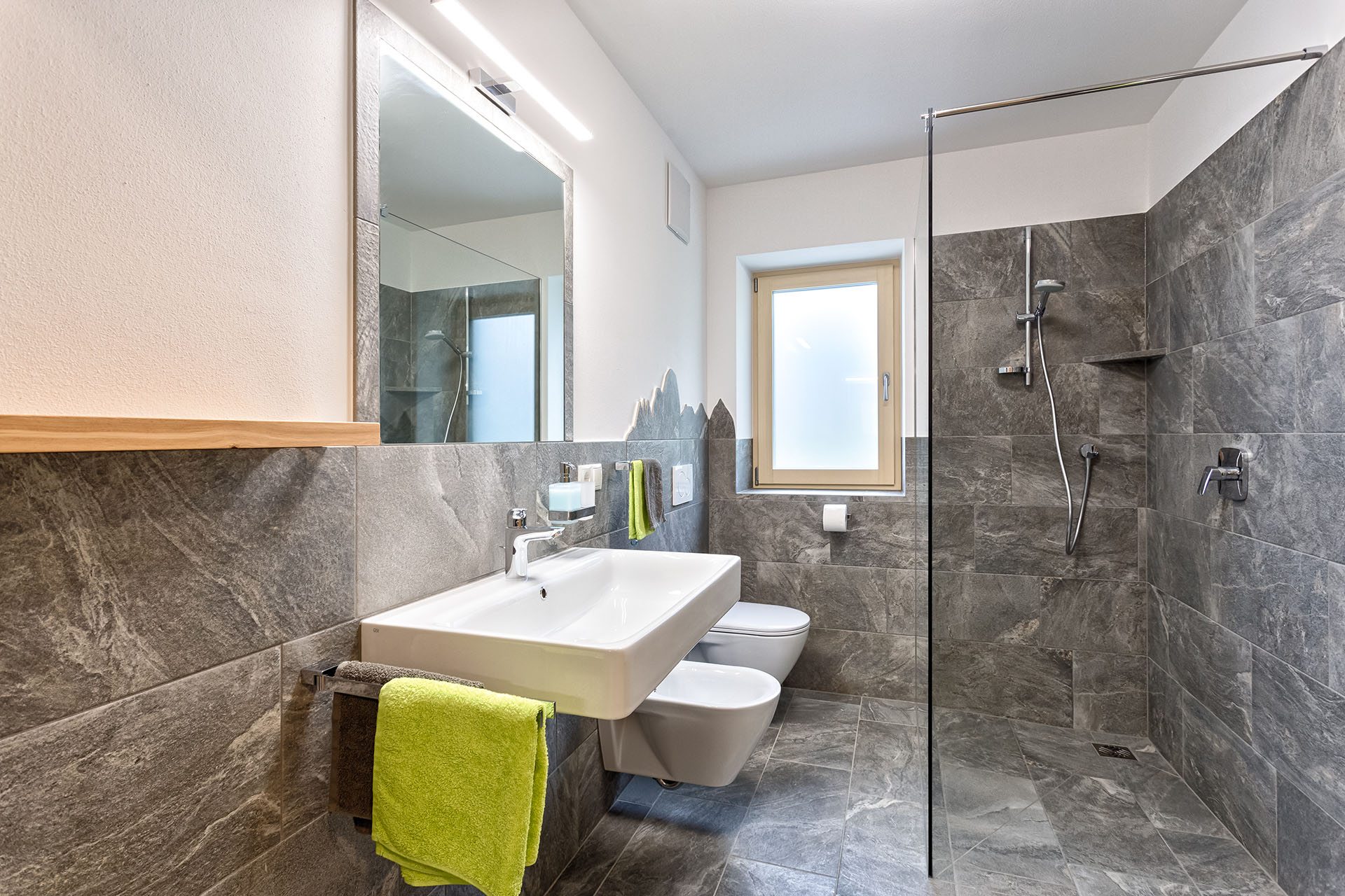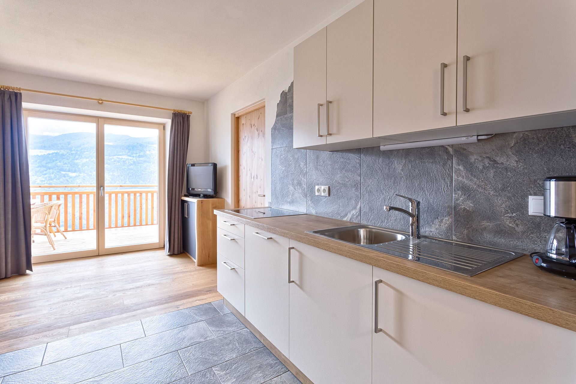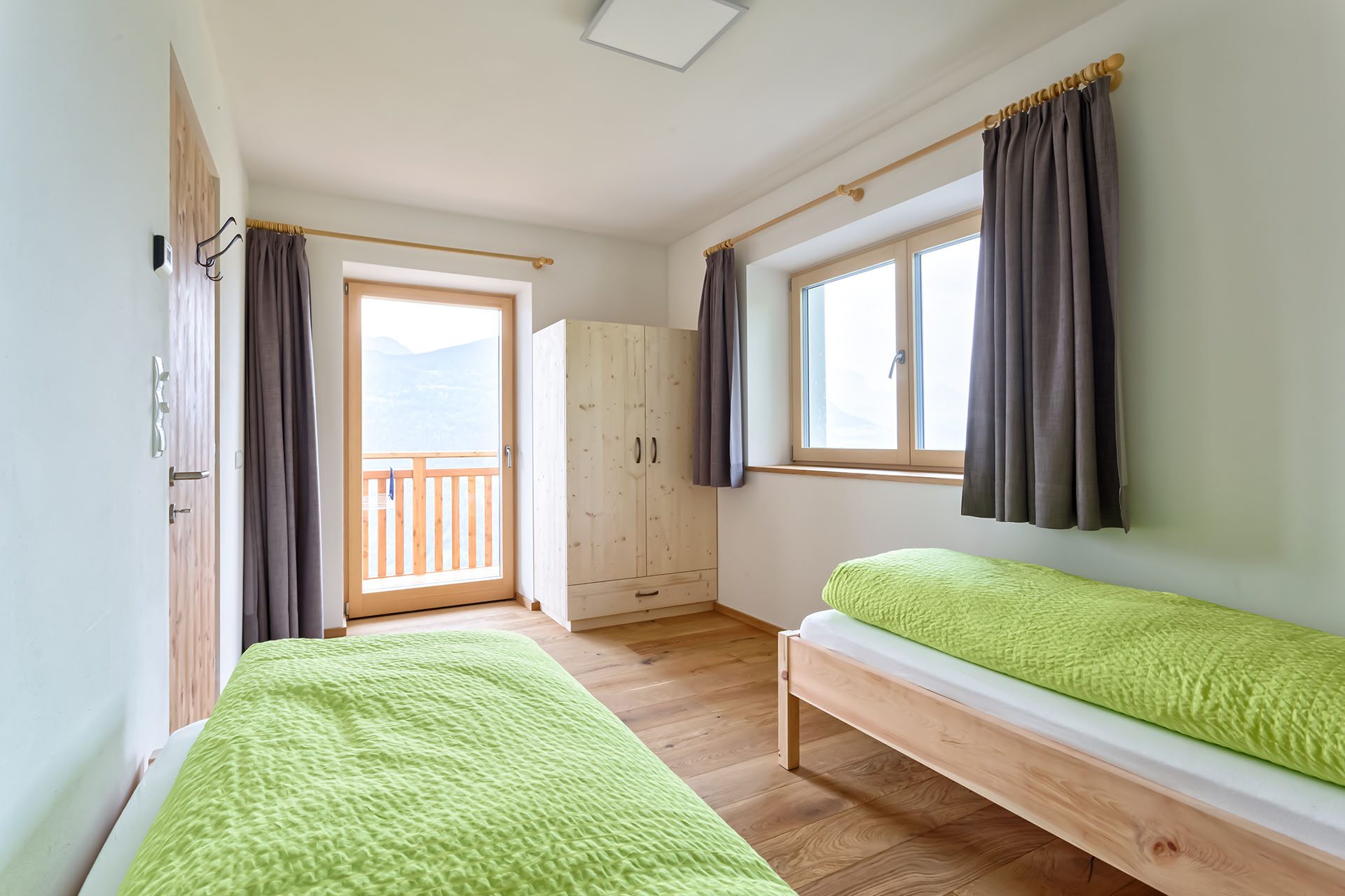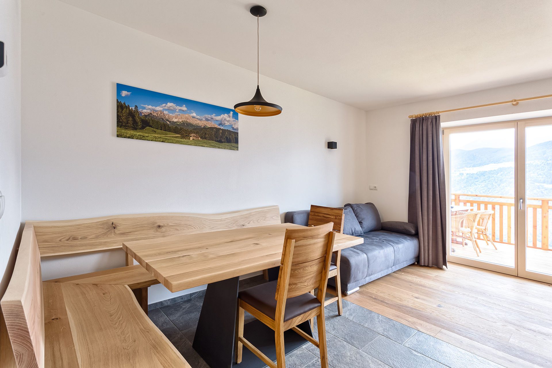I materiali naturali degli appartamenti danno la sensazione di un’assoluta vicinanza alla natura: pavimenti in legno e piastrelle di pietra, alcuni mobili in pino cembro, abete rosso e quercia sono stati realizzati da Markus, il proprietario, e coniugano tradizione ed innovazione.